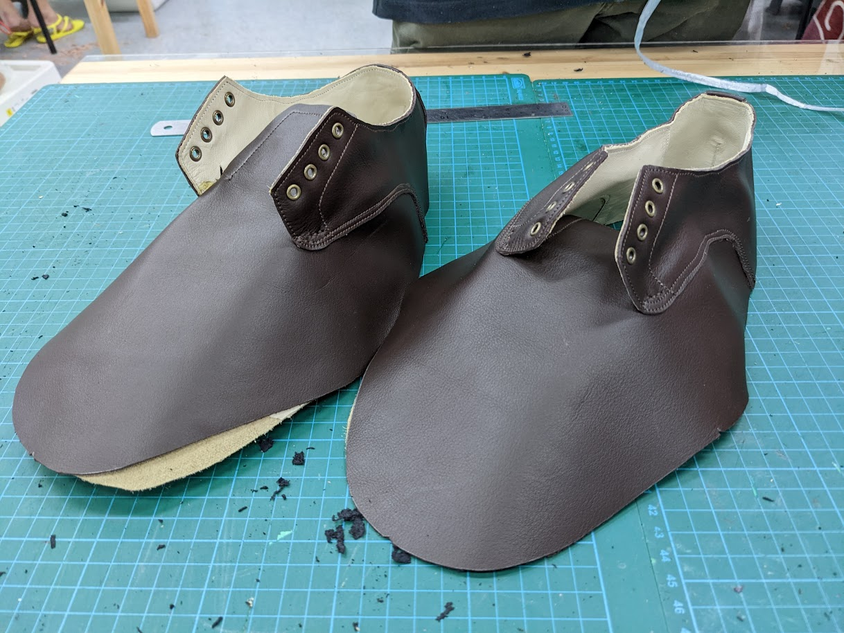 Like with the sample uppers and linings, the actual leather panels are stitched and glued together, with the eyelets hammered and handstitches (no contrast on the actual shoe) sewn into place.